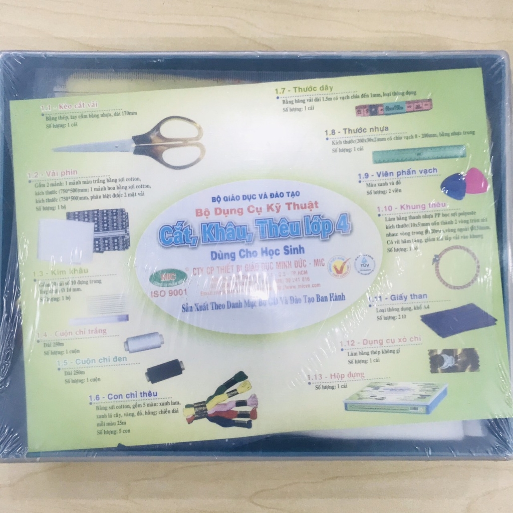 Bộ kỹ thuật cắt khâu thêu lớp 4 gồm: Kéo cắt vải Bộ Vải phin cotton Kim khâu Cuộn chỉ trắng Cuộn chỉ đen Con chỉ thêu Thước dây Thước nhựa Viên phấn vạch Khung thêu Giấy than Dụng cụ xỏ chỉ