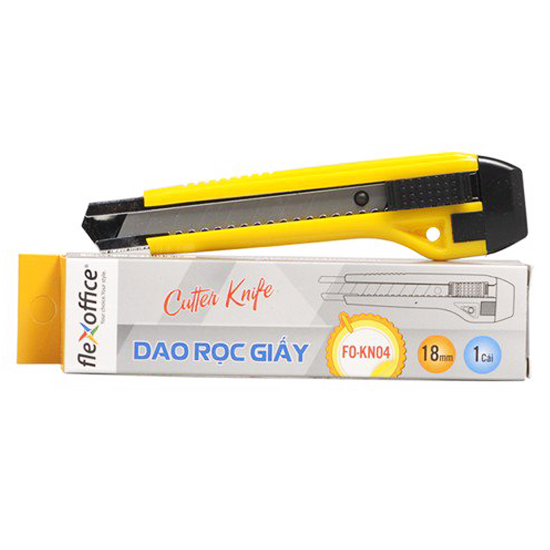 Dao cắt giấy FO-KN04 (dao rọc giấy) là loại dao cắt giấy loại lớn 18mm là dụng cụ văn phòng dùng để cắt giấy (rọc giấy) dao cắt giấy FO-KN04 có lưỡi dao thay thế. FO-KN03, FO-KN04 là sản phẩm dao cắt giấy cao cấp thuộc nhóm dụng cụ văn phòng, mang nhãn hiệu Flexoffice.